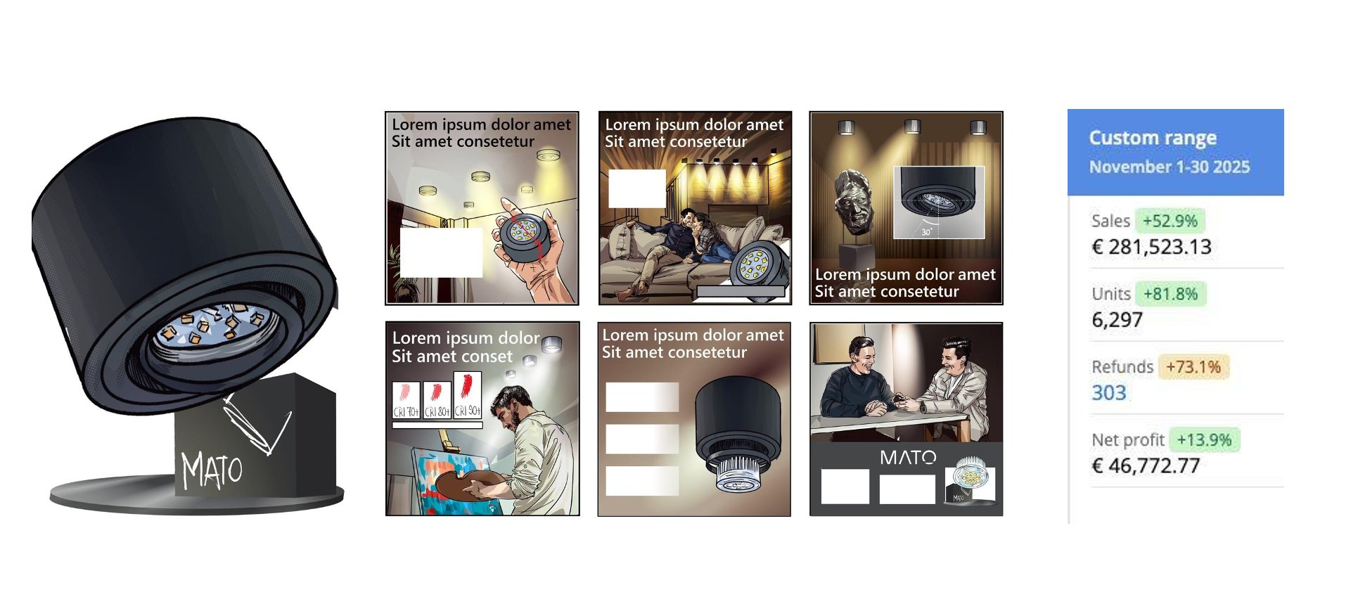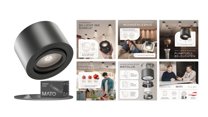 Our approach was to develop a design language for MATOLUX that stands out in the lighting accessories market while also conveying maximum professionalism. Through high-quality renderings, we were able to create a striking presentation and produce distinctive flexi listings. The result: visually strong listings, clear brand recognition, and performance metrics at a top-tier level. Particularly important for Markus: even before implementation, a well-thought-out and unique concept was already in place—so everyone knew the strategy behind the visuals.